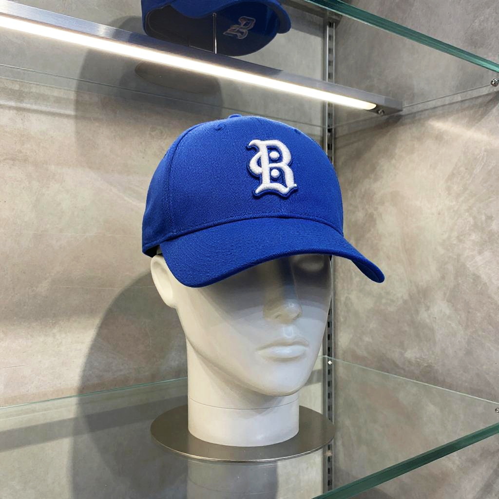 A baby blue padres hat displayed prominently on a mannequin head in a modern sports store, sleek interior design with glass shelves and bright LED lighting
