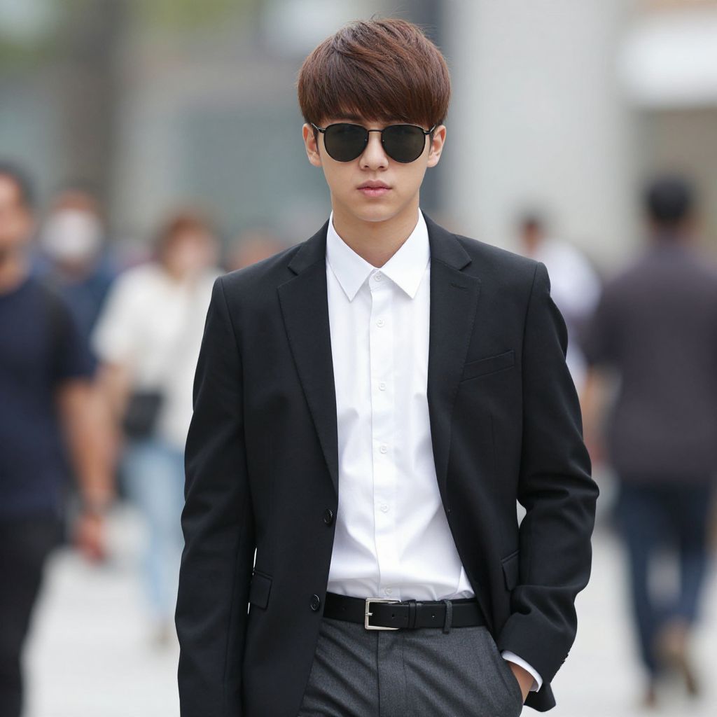 Photograph of a young Asian man with fair skin and short, dark brown hair styled in a sleek, side-swept manner. He wears black, round sunglasses, a black suit jacket, a white dress shirt, and dark gray trousers with a black belt. His right hand is in his pocket, and he has a neutral, confident expression. The background is blurred with indistinct figures and a bright, urban environment, suggesting a busy street scene. The overall style is modern and chic, with a focus on sharp contrasts between the black suit and white shirt.