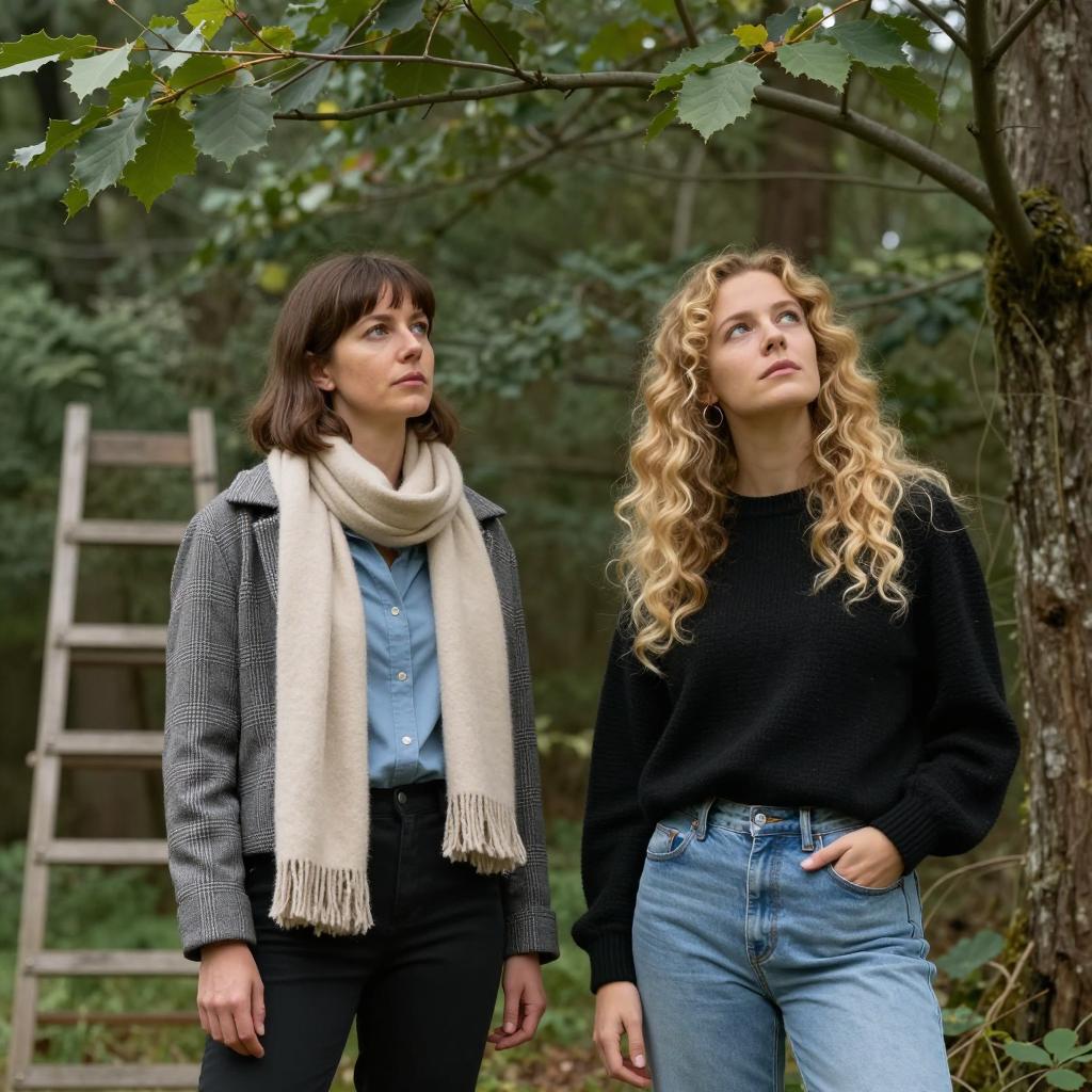 Two people standing outdoors. Man with curly brown hair, medium build, wearing orange patterned shirt with black collar. Woman with short brown hair, slim build, wearing white t-shirt and blue baseball cap. Man's arm around woman's shoulder. White wooden house with satellite dish in background. Greenery and trees behind them. Both have neutral expressions.