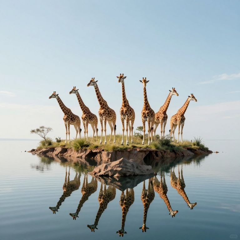A surreal herd of giraffes stands atop a floating island suspended in the sky, their forms mirrored perfectly in the tranquil waters below, defying gravity and reality alike.