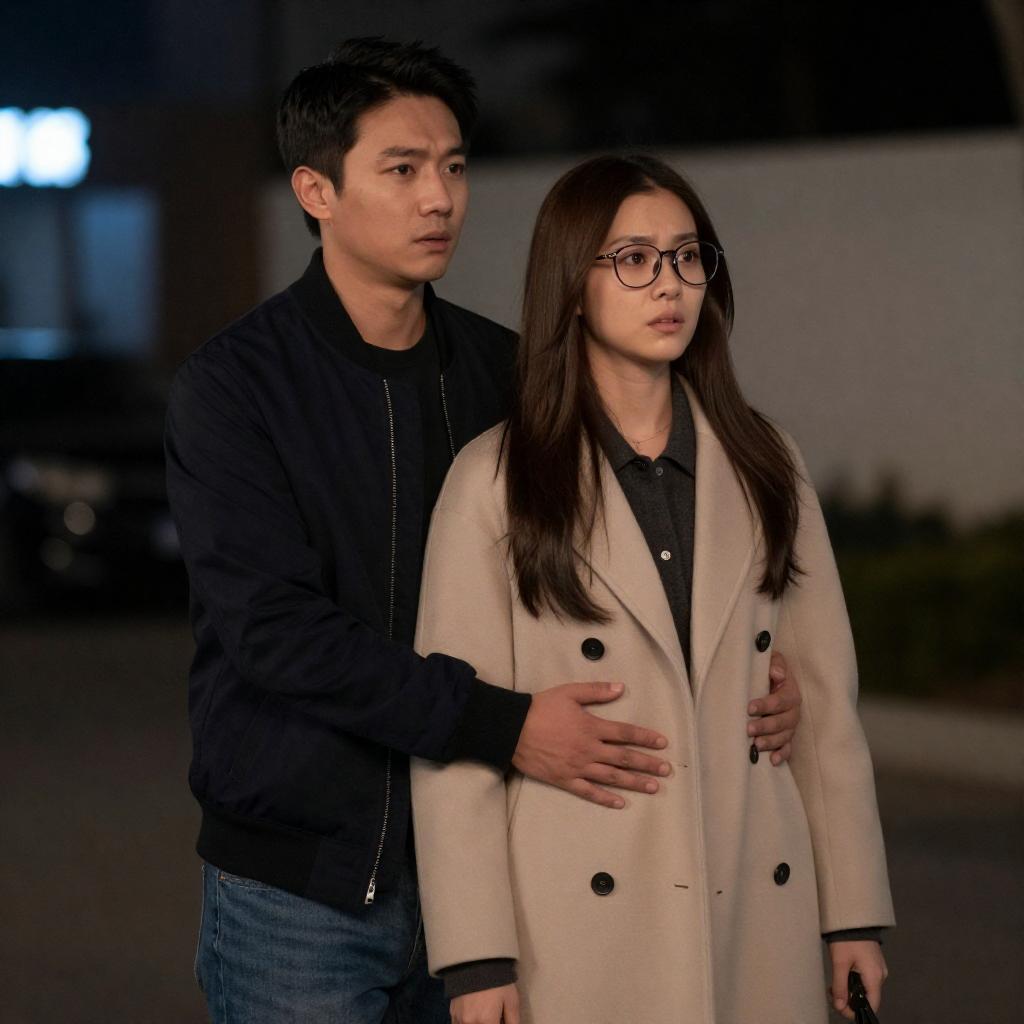 Photograph of a man with short black hair, wearing a dark jacket and blue jeans, standing behind a woman with long brown hair, glasses, and a beige coat. He has his arms around her waist, looking forward with a concerned expression. They are in a dimly lit, urban outdoor setting with blurred lights in the background.
