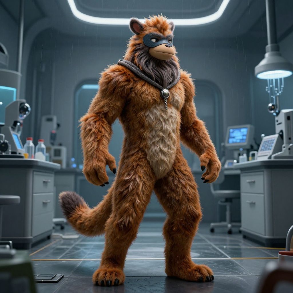 Digital art of a muscular, anthropomorphic, orange-furred raccoon in a lab, wearing a black mask and collar, standing confidently.
