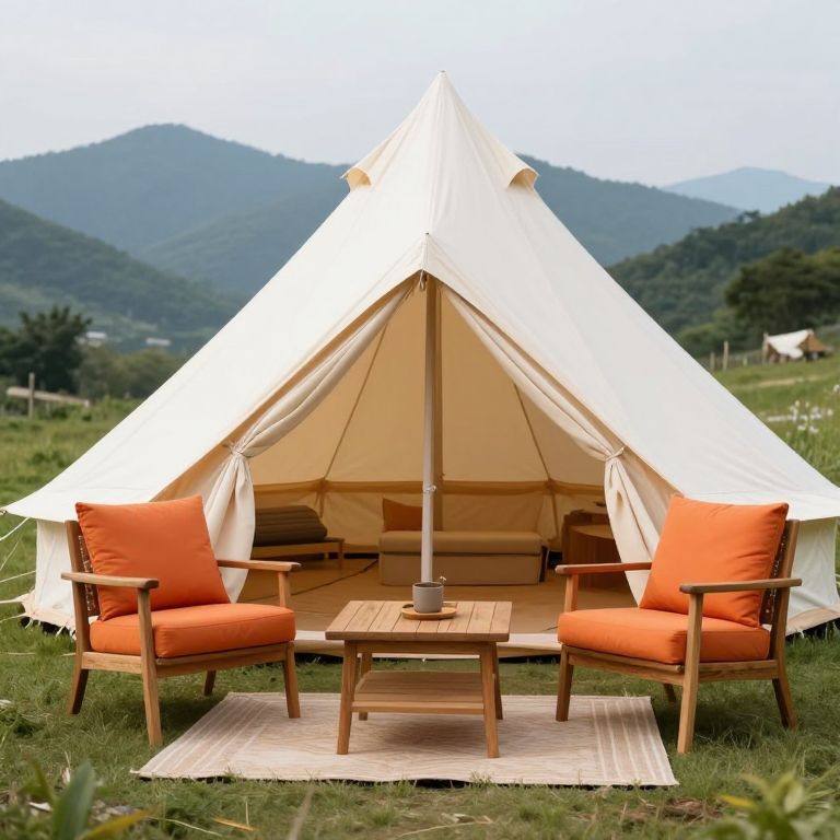 Luxurious bell tent setup featuring two wooden armchairs with orange cushions, a central wooden coffee table, and a cozy interior design, all situated on a grassy field with scenic mountain views in the background.