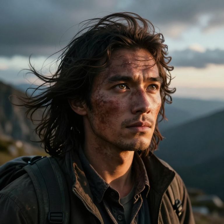 Craft an ultra-detailed portrait photograph of a mysterious traveler with piercing eyes and windswept hair, their features bearing the marks of time yet illuminated by a vibrant inner glow. This masterfully composed close-up captures them in motion, gazing ahead with a blend of curiosity and resolve amidst rugged mountains and tumultuous skies. The interplay of sunlight and shadow on their weathered face conveys an emotional spectrum of introspection and resilience, inviting viewers to glimpse into their soul and partake in their journey towards the horizon.
