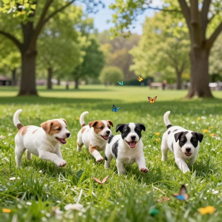 Photograph of four playful, white and brown Jack Russell puppies running in a sunlit, green park with colorful butterflies and trees in the background.