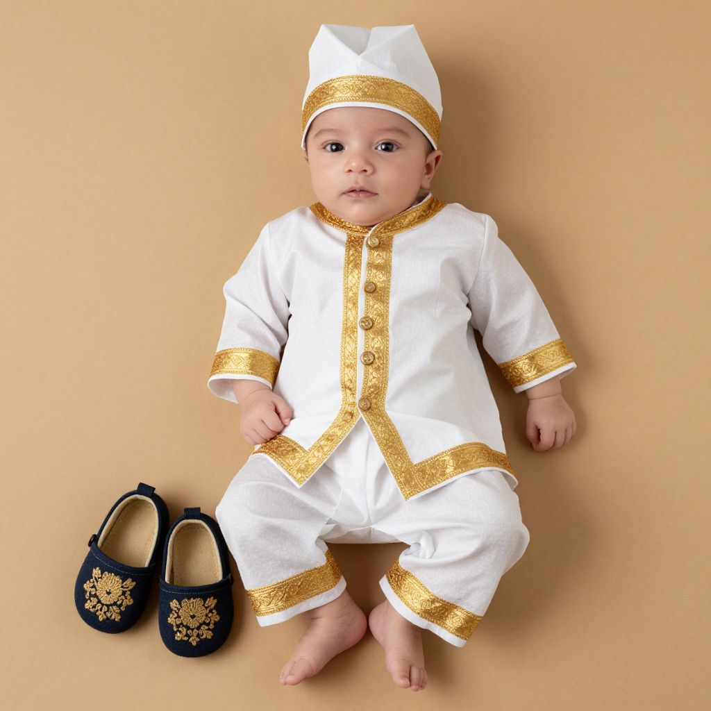 Photograph of an infant in white traditional attire with gold trim, matching hat, and black embroidered shoes, against a beige background.