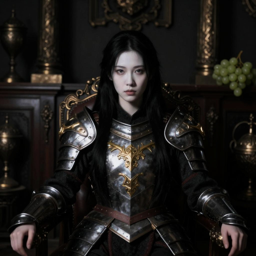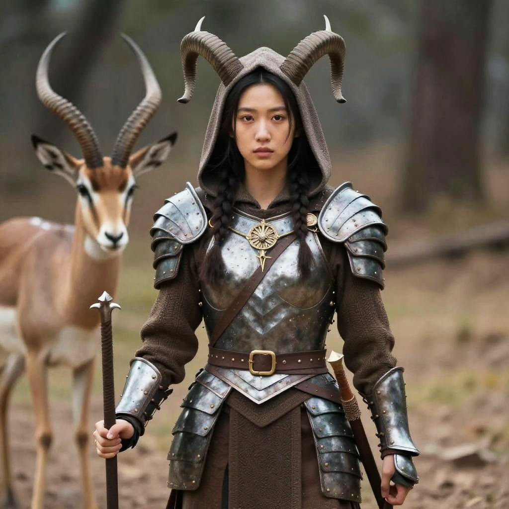 Antelope, woman in armor with horns and a hood on