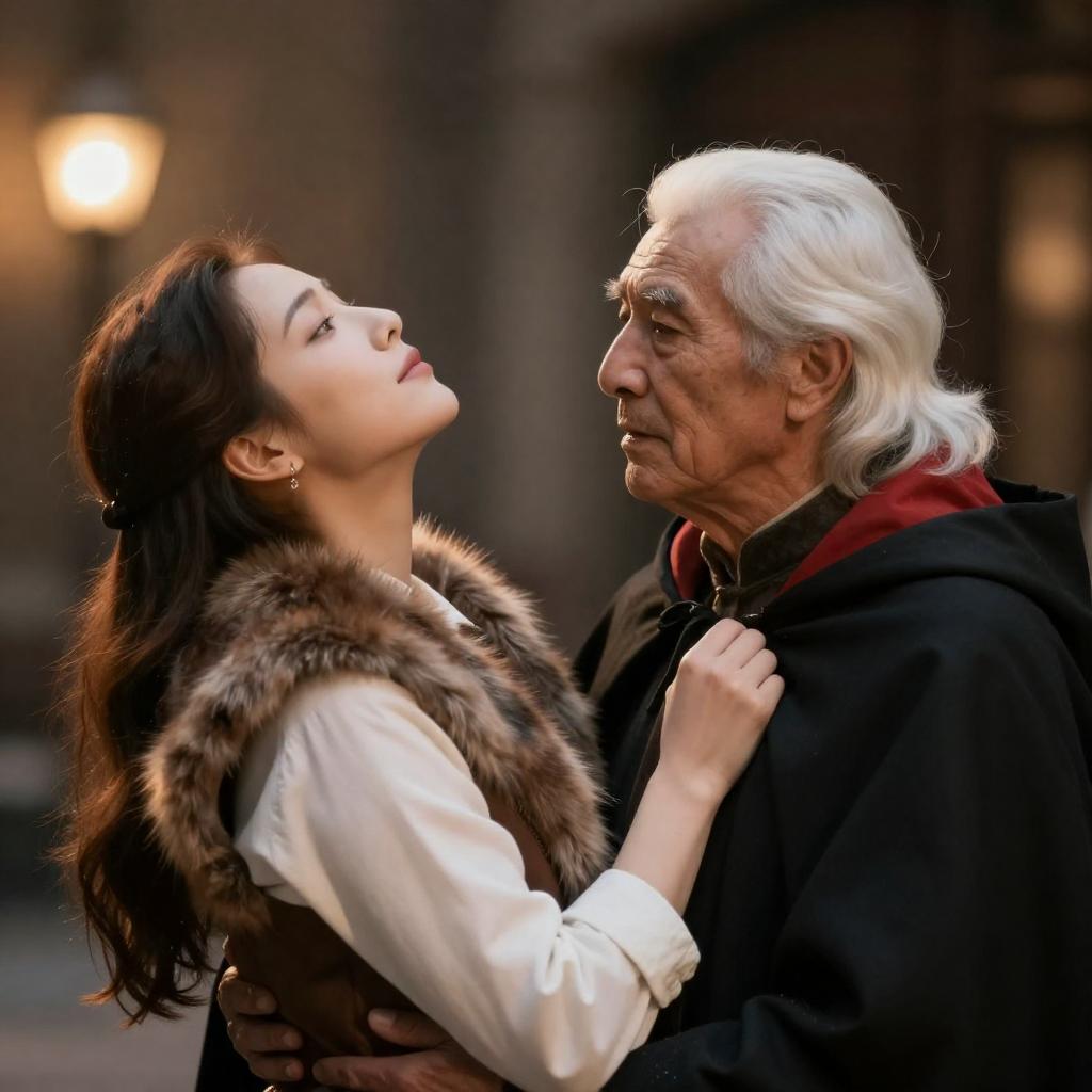 Photograph of an older man with gray hair, wearing a black beret and brown jacket, holding hands with a young woman with long black hair, looking into each other's eyes. They are illuminated by soft, warm light against a dark, blurred urban background. The man's expression is gentle, and the woman's gaze is focused and tender.