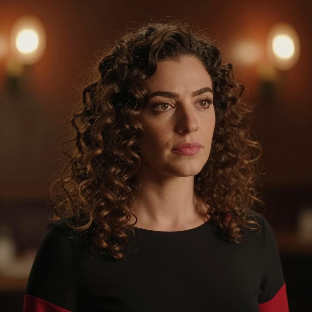 A woman with curly brown hair, wearing a black top with red accents, looking slightly to the right with a neutral expression. Warm, blurred orange lights in the background. Dark, out-of-focus setting. Single subject.