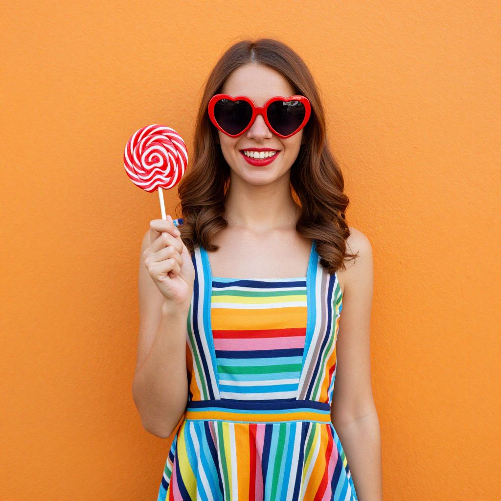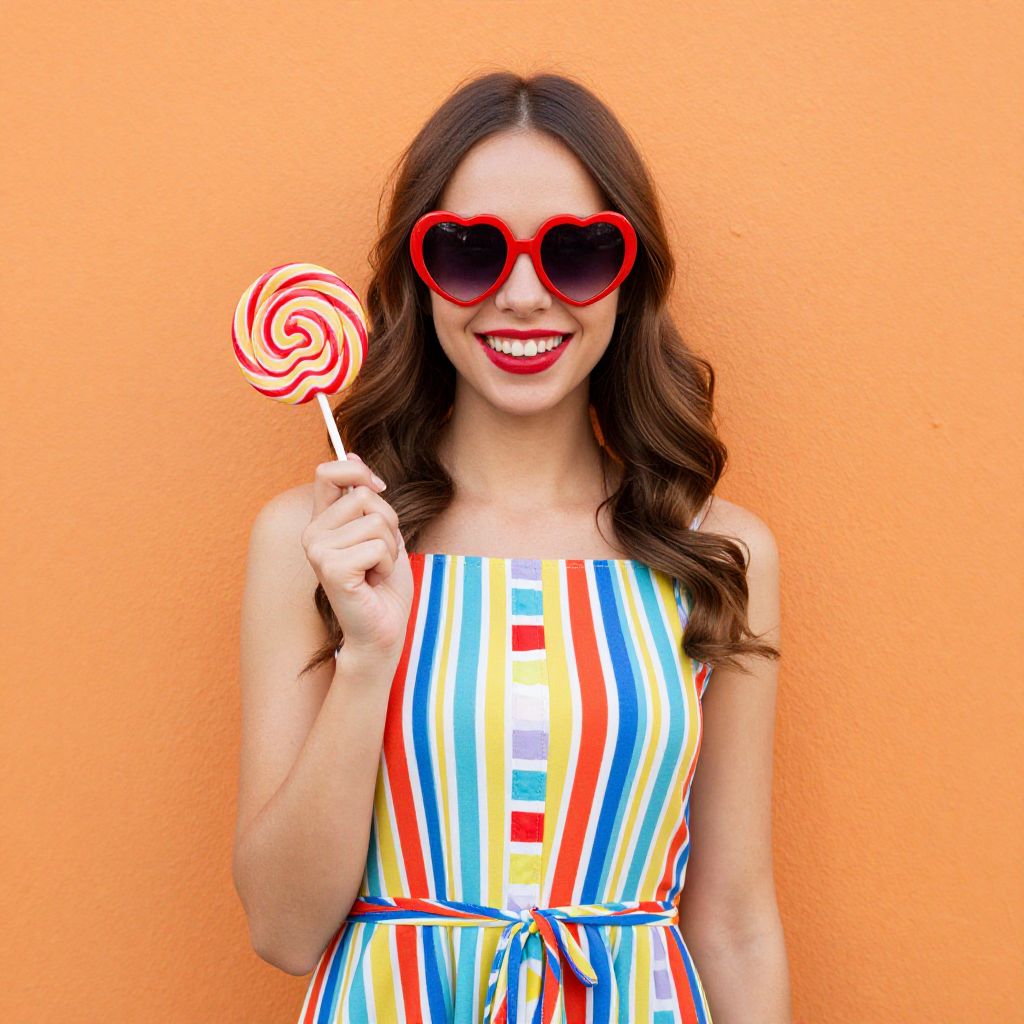 Woman wearing vibrant red heart-shaped sunglasses and a colorful striped dress stands against an orange wall, holding a red-and-white spiral lollipop in her right hand while smiling brightly.