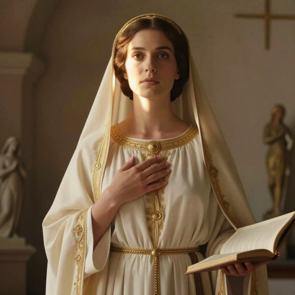 Photograph of a young woman in a medieval-style church, dressed in a cream-colored, ornately-gold-embroidered nun's habit with a veil. She has fair skin, brown eyes, and short brown hair. Her right hand rests on her chest, while her left hand holds an open book. The background features a blurred, wooden cross on a white wall and a stone statue on the left. The lighting creates a soft, warm glow on her face and habit. The overall mood is serene and contemplative.