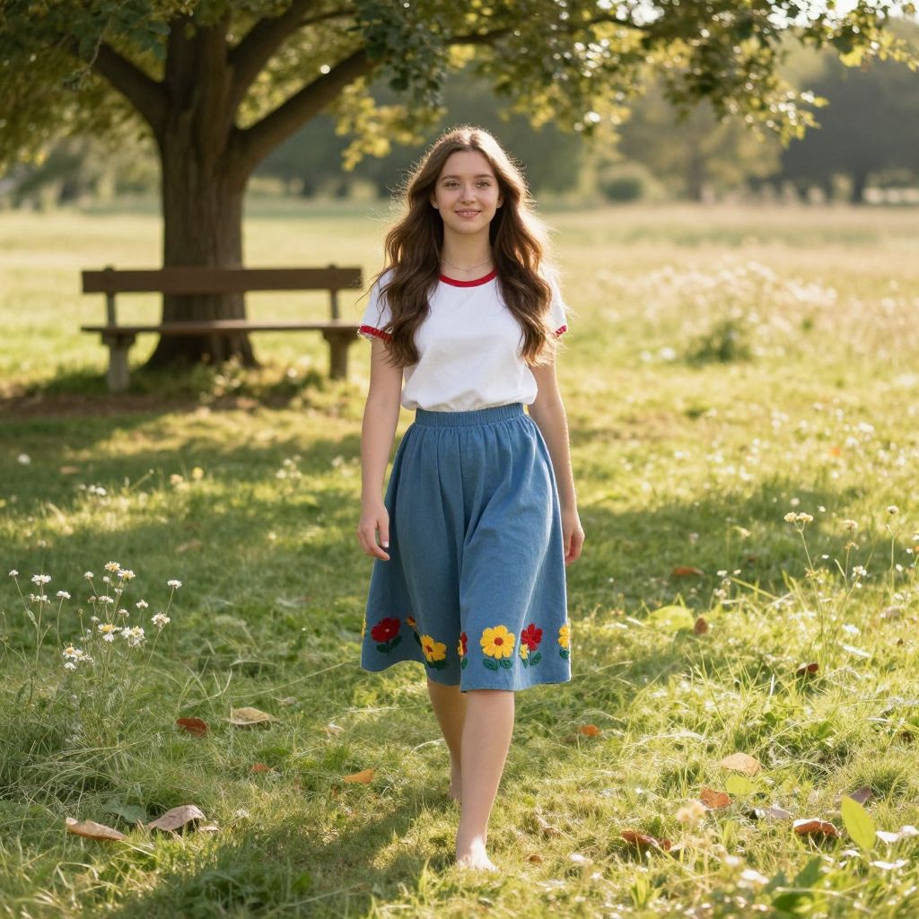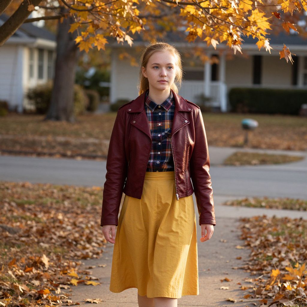 A young woman with fair skin and bright blue eyes walking through a quiet suburban neighborhood in the fall, dressed in a classic burgundy leather jacket, a flannel shirt, and a mustard-yellow skirt, the golden hour lighting highlighting her silhouette against a backdrop of crisp, dry leaves and falling maple branches.