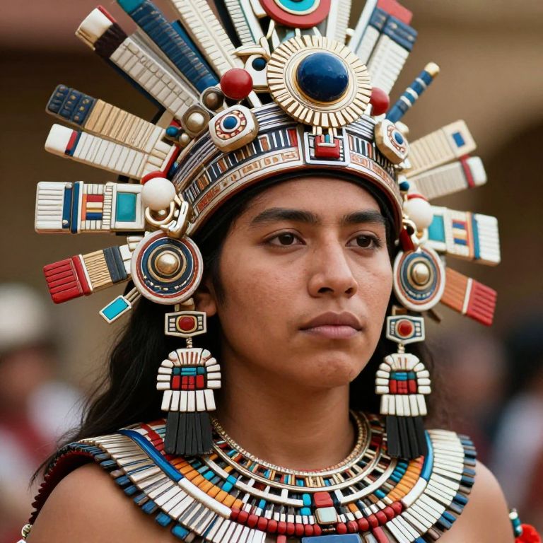 "Traditional Aztec, a close up of a person wearing a headdress and a necklace"