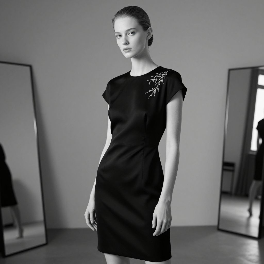 A striking black and white fashion muse stands in a sleek, minimalist studio with soft natural light, her porcelain-like skin and sharp, defined features enhancing her monochrome elegance, wearing a tailored black silk dress with subtle white embroidery, surrounded by mirrors and neutral tones that highlight her serene expression and poised posture.