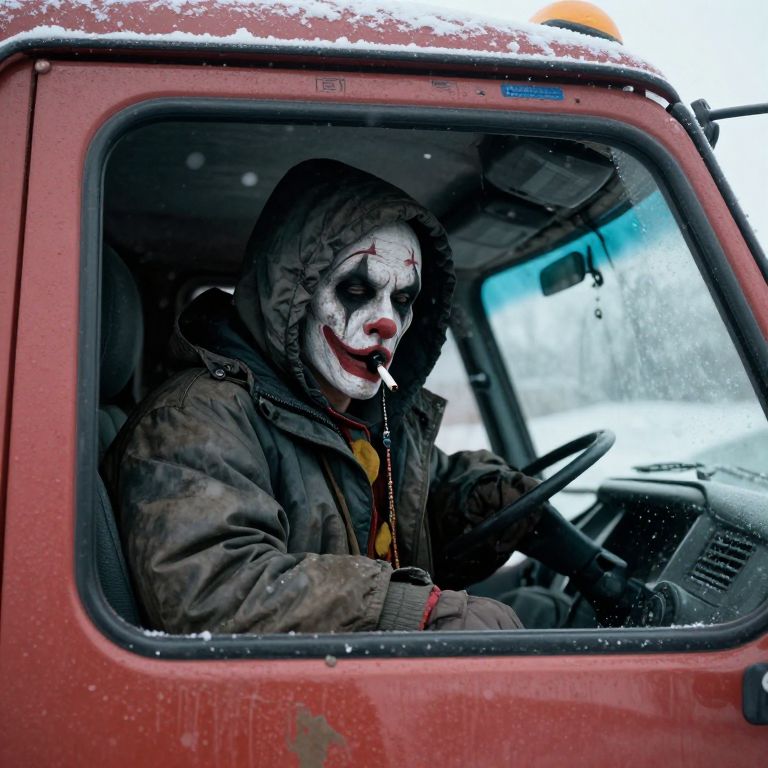 A depressed, sad, run-down, scary clown wearing a hooded winter parka has a side whistle in his mouth and is sitting in the passenger seat next to a dirty old truck driver in the cabin of a semi truck, The truck driver is smoking a cigarette and looks visibly annoyed, The picture is taken from the perspective of in front of the semi truck, looking in through the windshield, It is snowing, The image looks photorealistic with great attention to detail