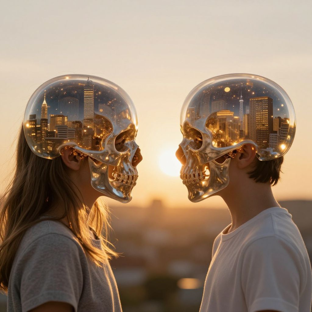 Photograph of a young woman and man standing close, silhouetted against a golden sunset. Both wear white t-shirts; their heads are replaced with reflective, gold-plated skulls. The skulls mirror a cityscape with tall buildings and glowing lights, creating an urban reflection within the skulls. The woman has long, wavy brown hair, while the man's hair is short and dark. The background is a softly blurred sunset with warm orange and yellow hues. The image combines surrealism with realistic photography, emphasizing the contrast between the natural sunset and the metallic, urban-themed skulls.
