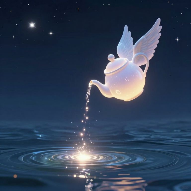 An ethereal teapot adorned with wings, suspended above a shimmering sea, pours liquid light that dances with the stars, symbolizing the eternal cycle of renewal and the quiet serenity of cosmic solitude.