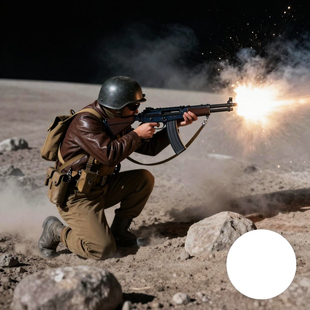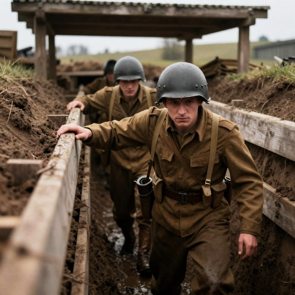 Photograph of a young male soldier in World War I gear, crouching and aiming a rifle. He has fair skin, blue eyes, and a focused expression. He wears a metal helmet, brown uniform, green gloves, and a backpack. Dirt and sandbags fill the background. His right hand grips the rifle stock, and his left hand supports his aim on the ground. The soldier's posture is low and concentrated.