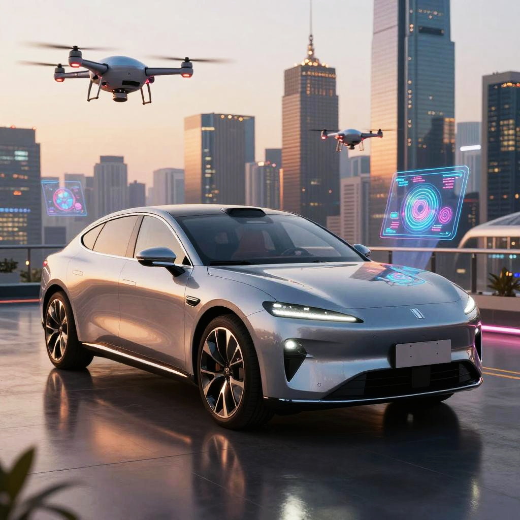 Avatr luxury electric sedan in a futuristic cityscape with flying drones and holograms, chrome and glass surfaces reflecting colorful lights, dusk setting with warm hues, highly detailed concept art, digital painting