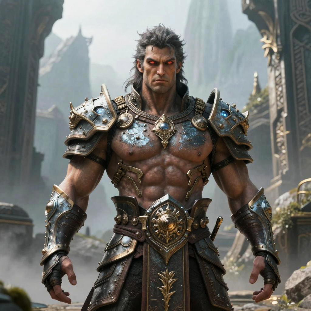 CGI fantasy image of a muscular, gray-haired warrior with red eyes, wearing ornate, metallic armor, standing in a misty, ancient temple