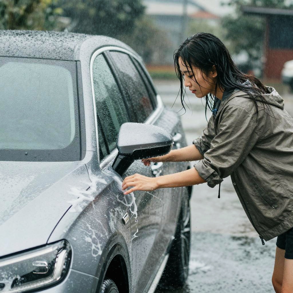 Rain woman washing car, mid-action splashing water, rain-soaked hair and clothes, sleek modern vehicle, rainy day ambiance, high detail, soft shadows, watercolor effect