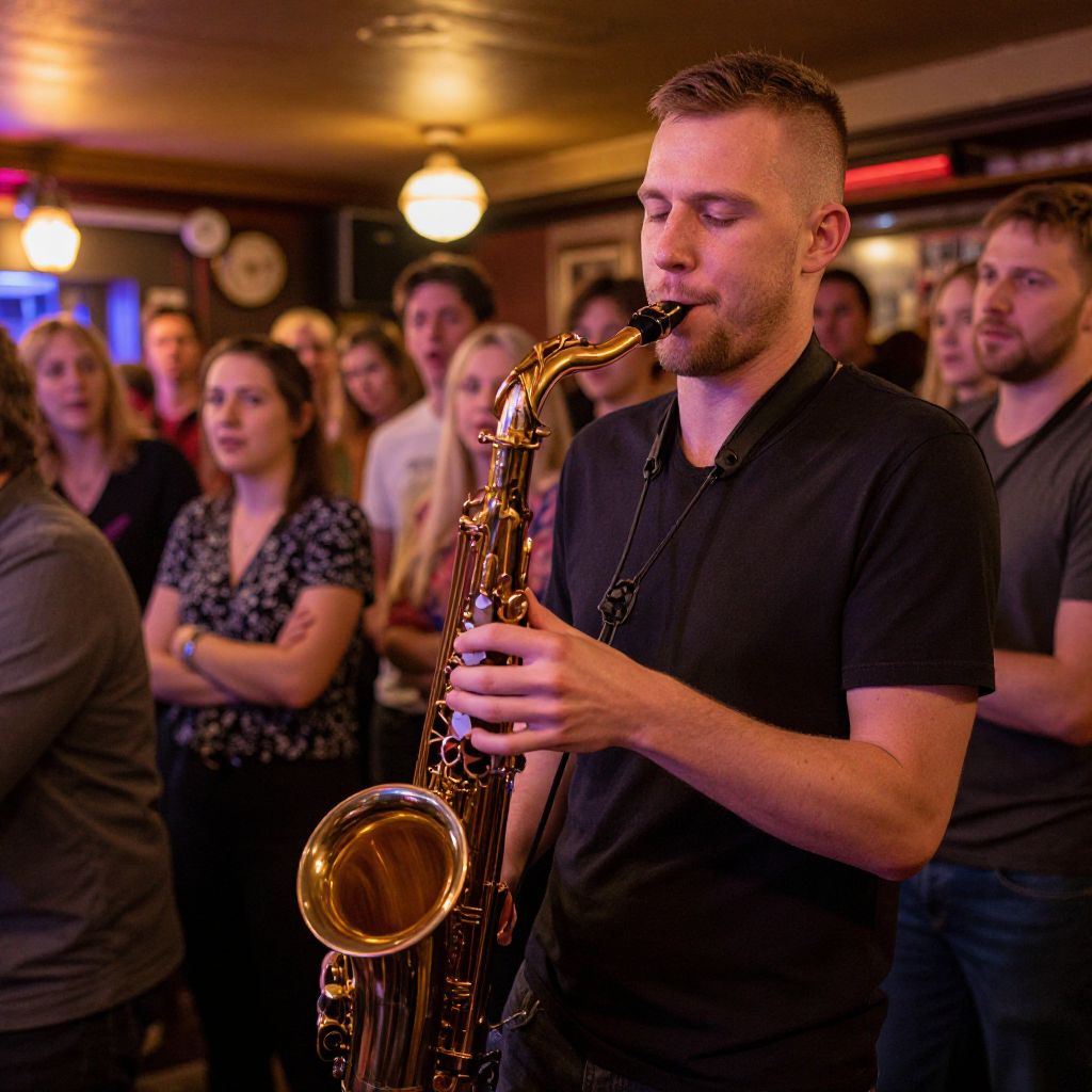 Photograph of a young, fair-skinned man with short brown hair and a trimmed beard, wearing a black polo shirt, playing a shiny, golden saxophone in a dimly lit, cozy bar. He has a focused expression, eyes closed, and is positioned in the right foreground. Behind him, a diverse group of people, including a woman with brown hair in a black patterned blouse, are standing and listening intently. The background features warm, yellow and red lighting, blurred patrons, and wooden paneling. The overall mood is intimate and musical.