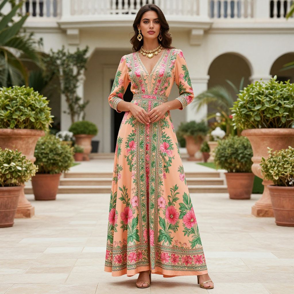Elegant woman standing gracefully in a vibrant Grand Stage Floral Maxi dress, featuring a peach base adorned with intricate pink and green floral patterns, complemented by gold jewelry and strappy sandals, amidst a serene garden setting with potted plants and classical architecture in the background.