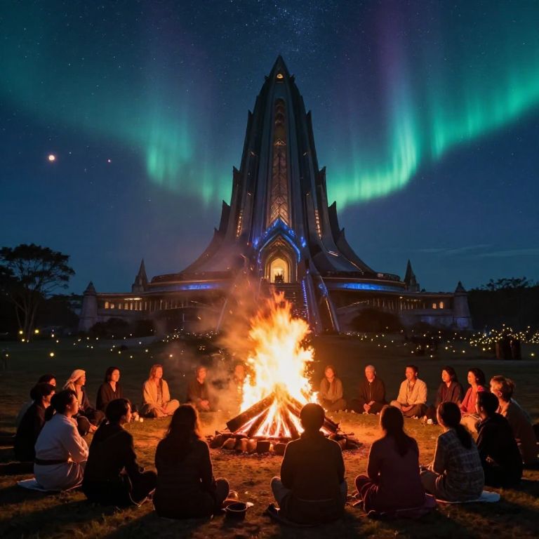 "Serene sacred humans gathering around a huge bonfire with a ancient future temple in the background, stars and northern lights above, and sparks and fireflies throughout the image,"