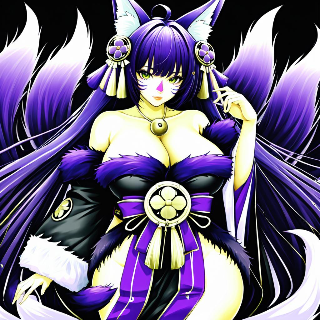 Digital anime-style illustration of a voluptuous, purple-haired female character with fox-like features, including large, white-tipped purple ears and nine flowing tails. She has a fair skin tone, striking yellow eyes, and a pink nose. She wears a black, off-shoulder kimono adorned with purple fur trim, a large purple obi with a golden bell, and a gold necklace with a circular pendant. Her long hair is accessorized with white hairpieces and purple ribbons. The background is entirely black, making her vibrant colors stand out. Her expression is confident, and she is holding one of her tails with a delicate hand.