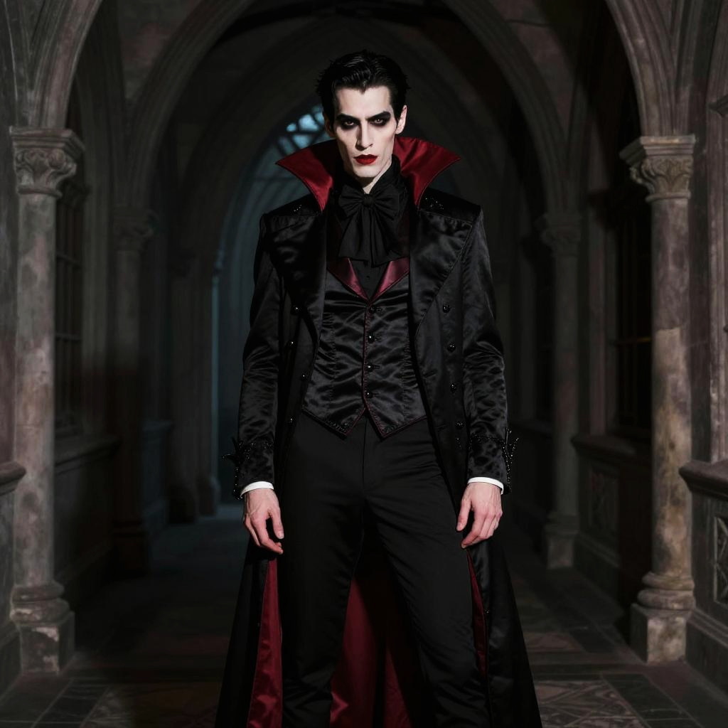 A striking male figure stands in a dimly lit gothic corridor, exuding an aura of mystery and elegance. Dressed in a dramatic black and red ensemble, he embodies a classic vampire aesthetic that evokes the themes of timeless horror and dark fantasy.