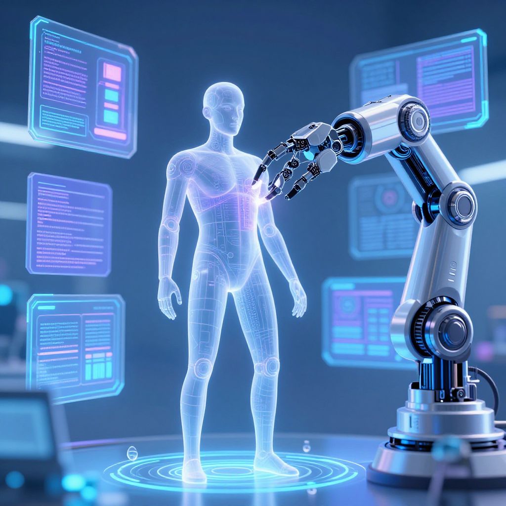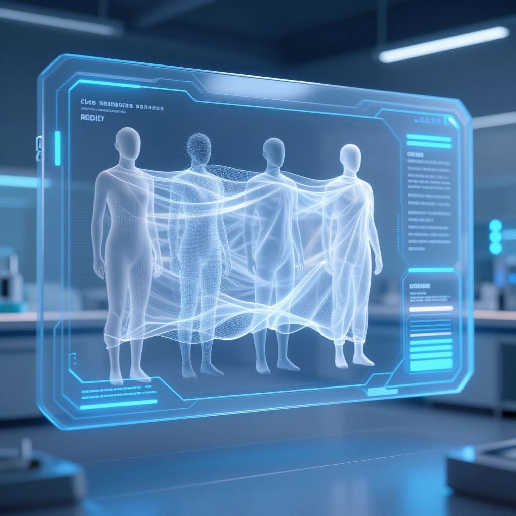 Futuristisches Labor mit schwebenden Knochenmodellen, transparente holographische Displays zeigen Knochenaufbau, kaltes Blau und Weiß, High-Tech Atmosphäre, ultra-detaillierte Knochenplatten und Gelenke, wissenschaftliche Präzision