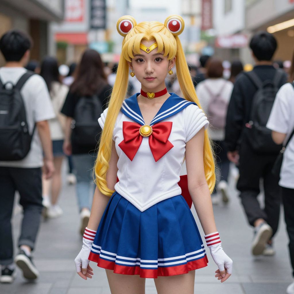 Sailor Moon Girl Costume, woman in a sailor outfit standing in a crowded street