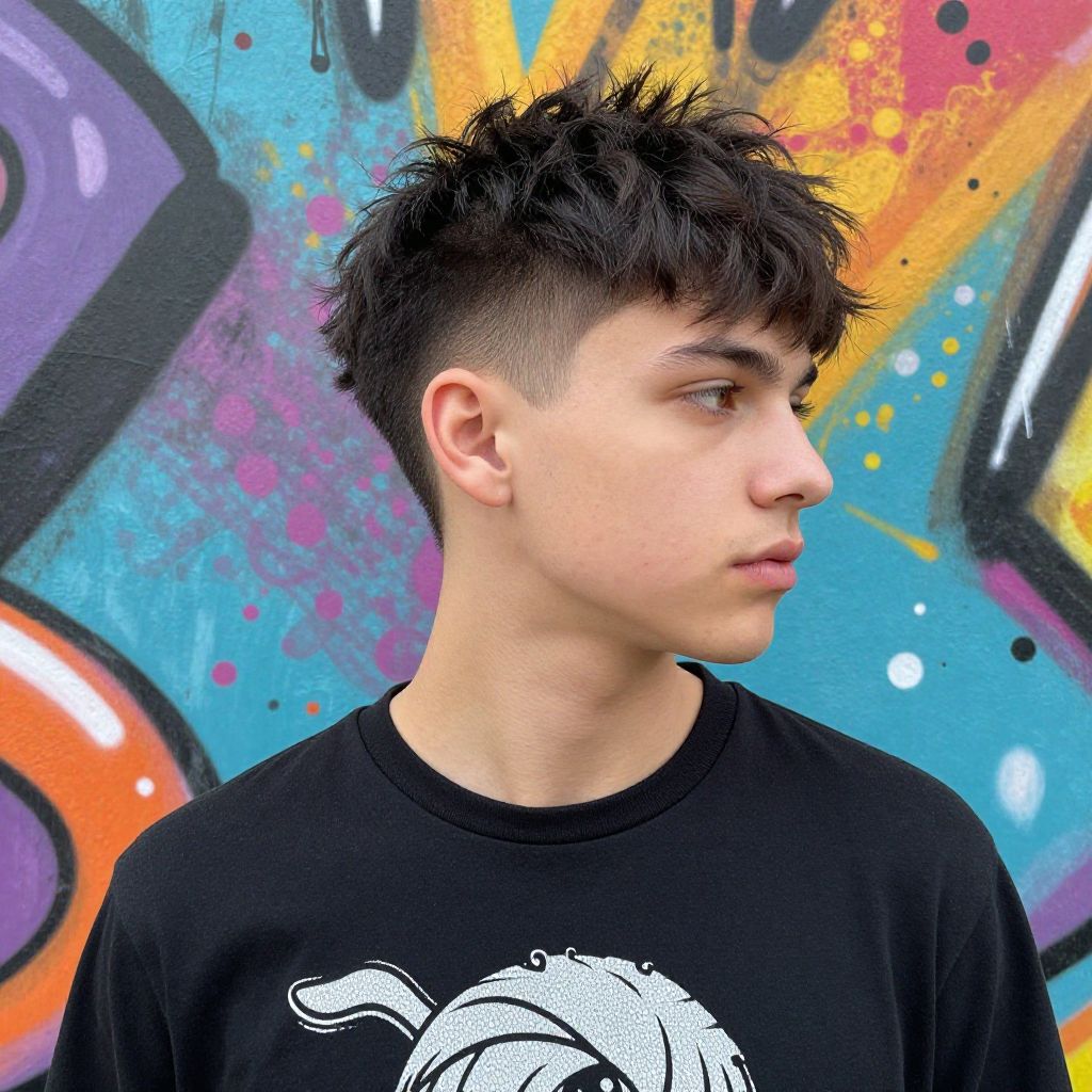 Dynamic image of a French crop with bangs on a young man, edgy haircut, vibrant street art background, casual urban style, bold colors, high detail, energetic vibe