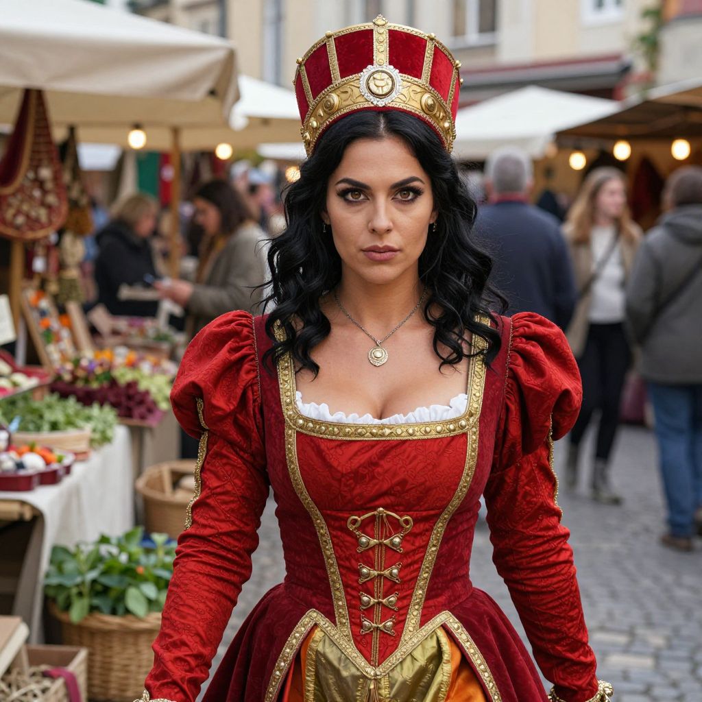 A detailed, high-resolution photograph of a bold, adventurous woman with dark wavy hair, intense hazel eyes, and a determined expression, wearing a vibrant medieval victorian dress, costume with bold reds, gold detailing, and a tall, structured headdress, walking through a bustling market square with stalls filled with herbs and handmade crafts, late afternoon lighting.. The woman has big tits and cute face