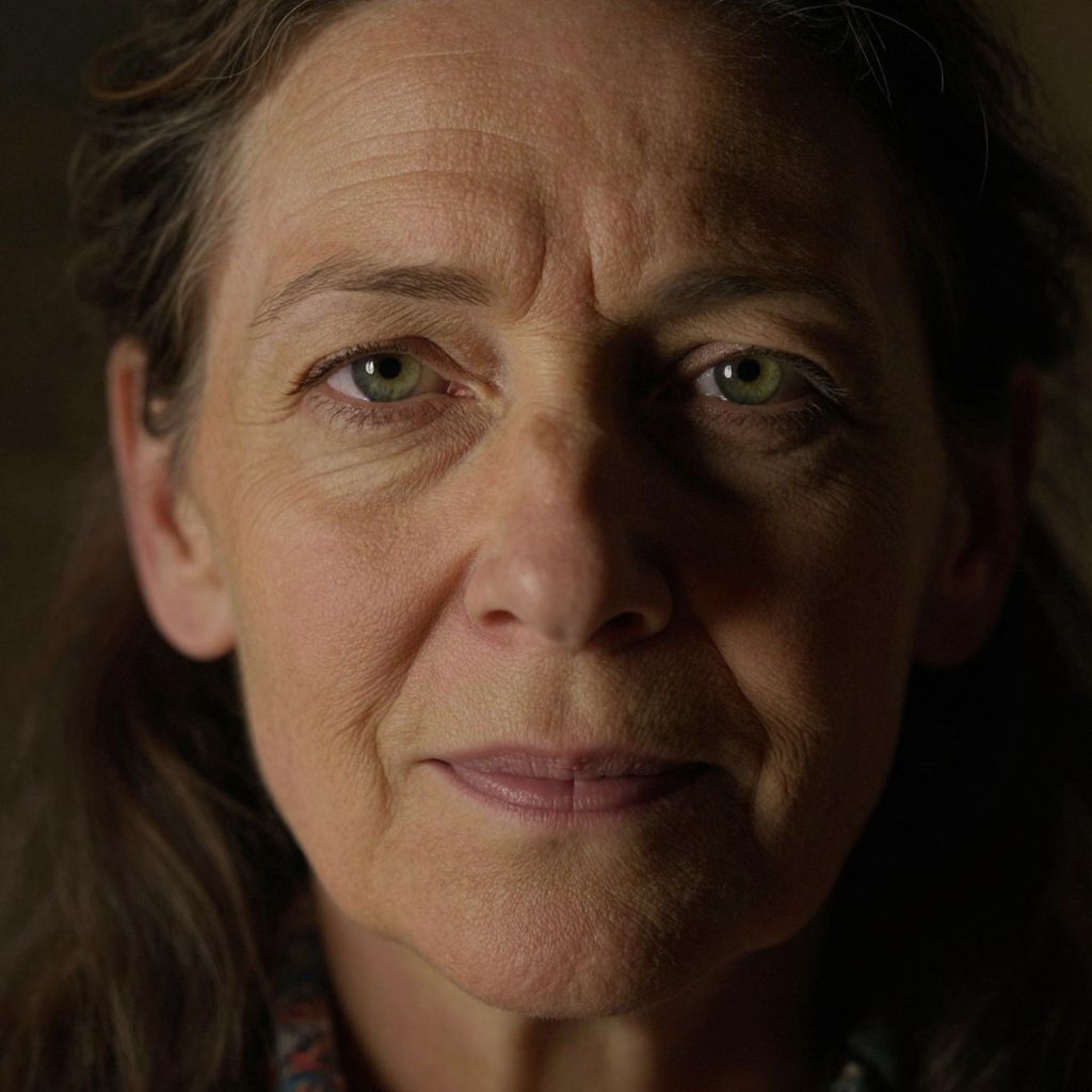 Close-up photograph of an older woman with green eyes, wrinkled skin, dark brown hair, and a serious expression, softly lit.