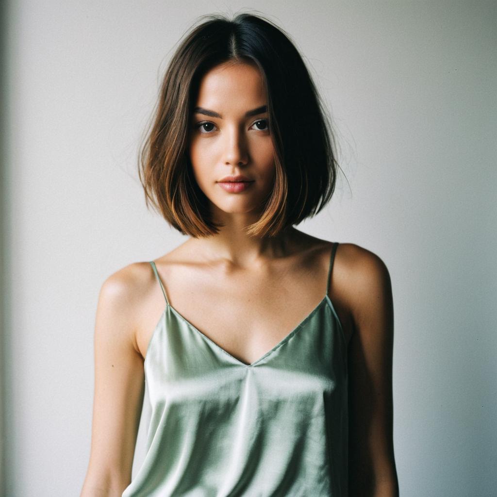 Young Woman with Shoulder-Length Bob Hairstyle in Silk Jumpsuit
