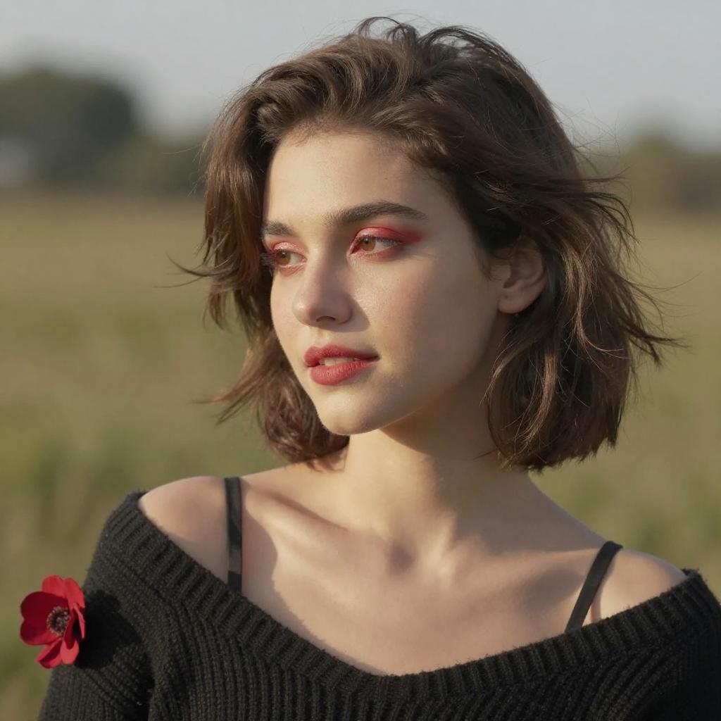 8K raw photo, Best quality, masterpiece, ultra high res, 1girl, looking away, solo, (small breasts:1.3), natural skin texture, realistic eye and face details, fluffy short hair, rouge \(makeup\), red eyeshadow, lipstick, little smile, black sweater, off shoulder, flower, sun, strap slip, brown hair, brown eyes, blurry, field, outdoors