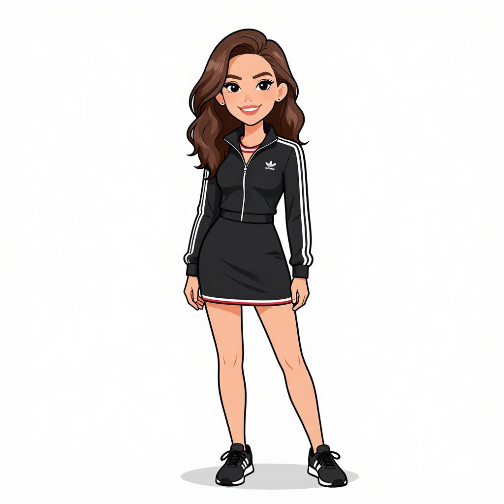 Digital illustration of a smiling young woman with long brown hair, wearing a black Adidas zip-up dress and sneakers, standing against a white background.
