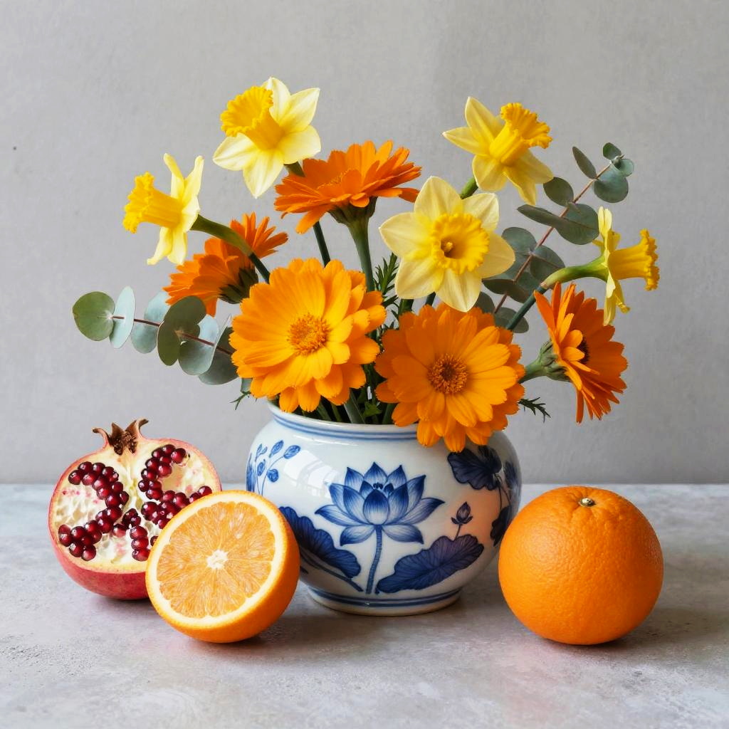A still life painting of a shiny porcelain bowl with blue lotus flower prints brimming with bright orange marigolds, yellow daffodils, and soft green eucalyptus leaves. In front rest a sliced orange with seeds, a halved pomegranate, and a whole orange on a clean surface; the simple light gray concrete backdrop keeps focus on form and color. Warm, balanced composition, soft natural light, gentle shadows, crisp edges, high detail, tasteful negative space, editorial quality, SDXL ready.