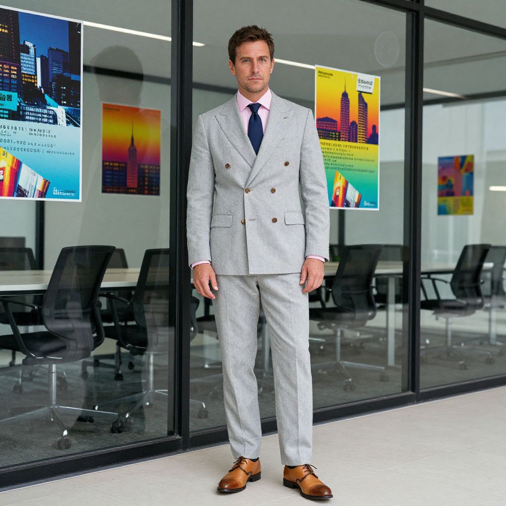 Photograph of a handsome man in a light gray double-breasted suit, white shirt, navy tie, and brown shoes, standing in a modern office