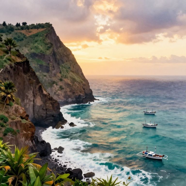 Madeira coastal scene at sunset with dramatic cliffs, crashing waves, traditional fishing boats on turquoise water, tropical vegetation, soft warm light, highly detailed, watercolor style
