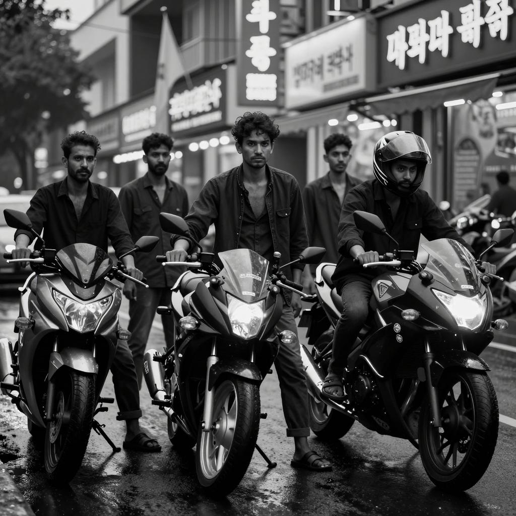 Black-and-white photo of five men in an urban setting with motorcycles. Four men stand around motorcycles, one riding a Suzuki motorcycle. Men wear dark, loose-fitting clothes, some with jackets. Background has illuminated signs and flags. Wet pavement reflects light. Central man with intense expression, others with neutral expressions. Motorcycle on right has headlight on.