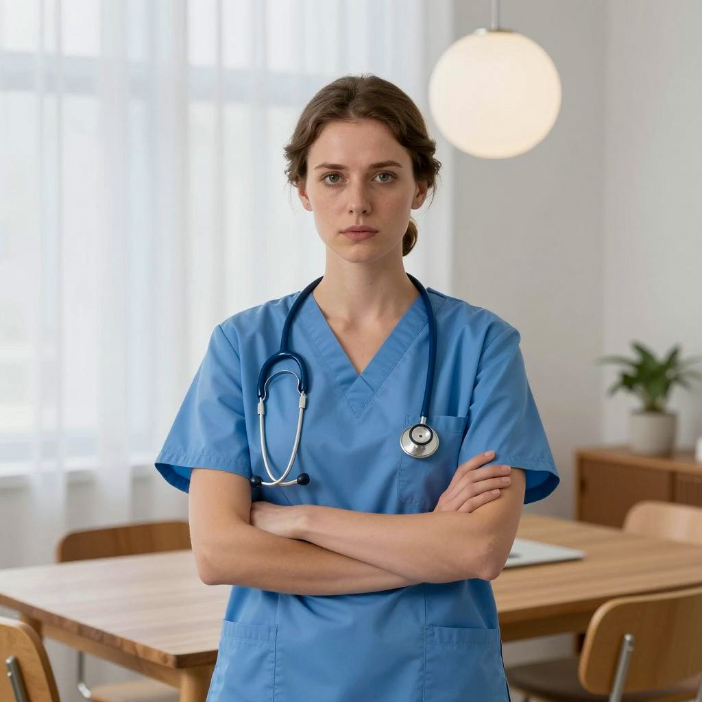 Blue scrubs costume, photograph of a female nurse, standing, blue scrubs, stethoscope around neck, arms crossed, brown hair in a bun, serious expression, indoor background, white curtains, round white lamp in background, wooden table with chairs, potted plant, soft lighting, realistic style, high quality