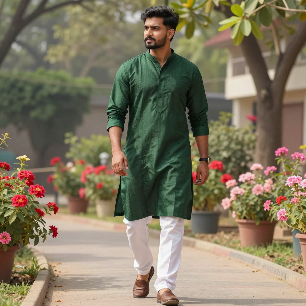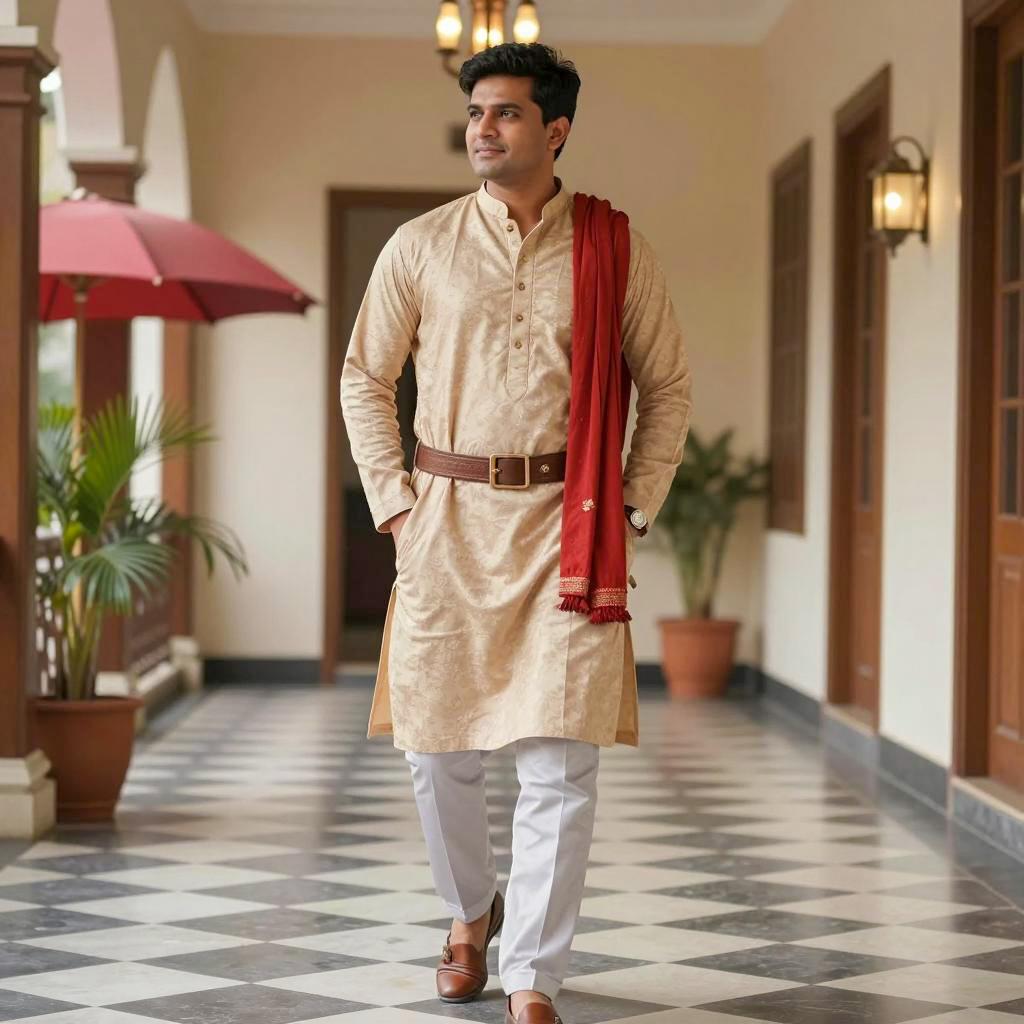 Indo western casual wear, photorealistic, Indian man, standing in hallway, traditional beige kurta, brown belt, red scarf draped over shoulder, light gray pants, brown shoes, hands in pockets, black hair, medium build, confident expression, background: checkered floor, chandelier above, potted plant with red umbrella, wooden columns, soft lighting, daytime, warm colors, elegant setting, modern traditional style, full body shot, realistic details, medium close-up, indoor scene