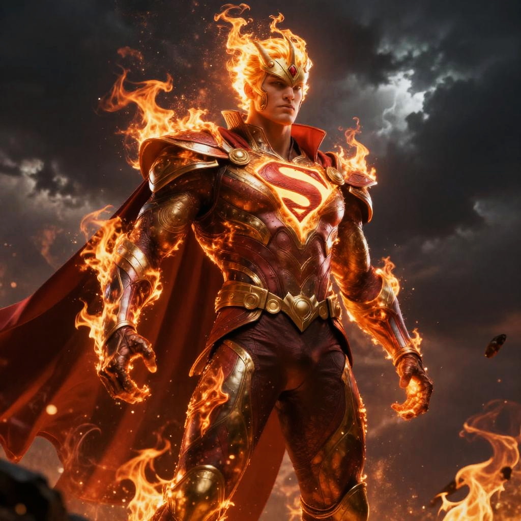 Superhero generator AI generating a powerful character with elemental abilities, fiery aura, flowing cape, intricate emblem on chest, dramatic stormy sky behind, fantasy realism style, rich textures, bold contrast between light and shadow, epic composition.