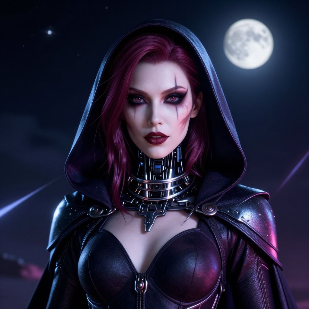 Masterpiece, best quality, a woman in a futuristic catsuit, pale skin, plum hair, in the dark night sky with stars in the background and a full moon in the sky, cybernetic, cyberpunk art, fantasy art, hooded cloak, thick heavy metal collar, demonic makeup, Masterpiece;highly detailed; extreme, octane render, zbrush, blender, 3d, post-processing, HDR; lightning; volumetric; cinematic; ray tracing; RTX;radiant light rays, subsurface scattering, soft edge lighting, realistic shadows;vibrant colors, high-res, 8k, 16k, 32k, Playful shadows dance across her face