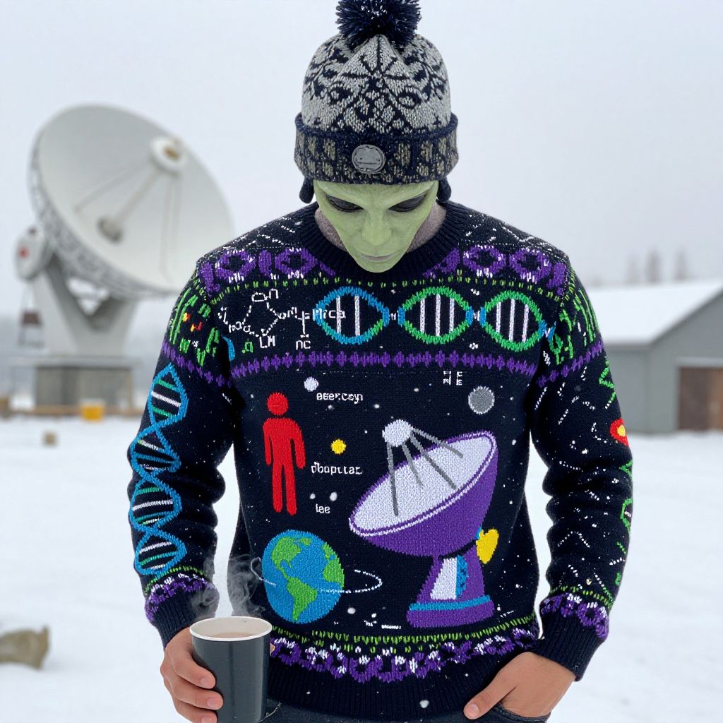 Alien wearing christmassweater with knitted pattern of Arecibo message, of graphical binary, depicting: atomic elements hydrogen carbon nitrogen oxygen phosphorus of DNA in purple, chemical compound formulae of DNA in green, double helix structure of DNA in blue, graphic figure of a human being in red, graphic of Solar System indicating planet earth in yellow, graphic of Arecibo radio telescope transmitting antenna dish in purple white blue knitting fashion shot, in blizzard, snow falling, at radio telescope, wearing woolly hat with bobble, holding steaming cup of cocoa, one hand in pocket