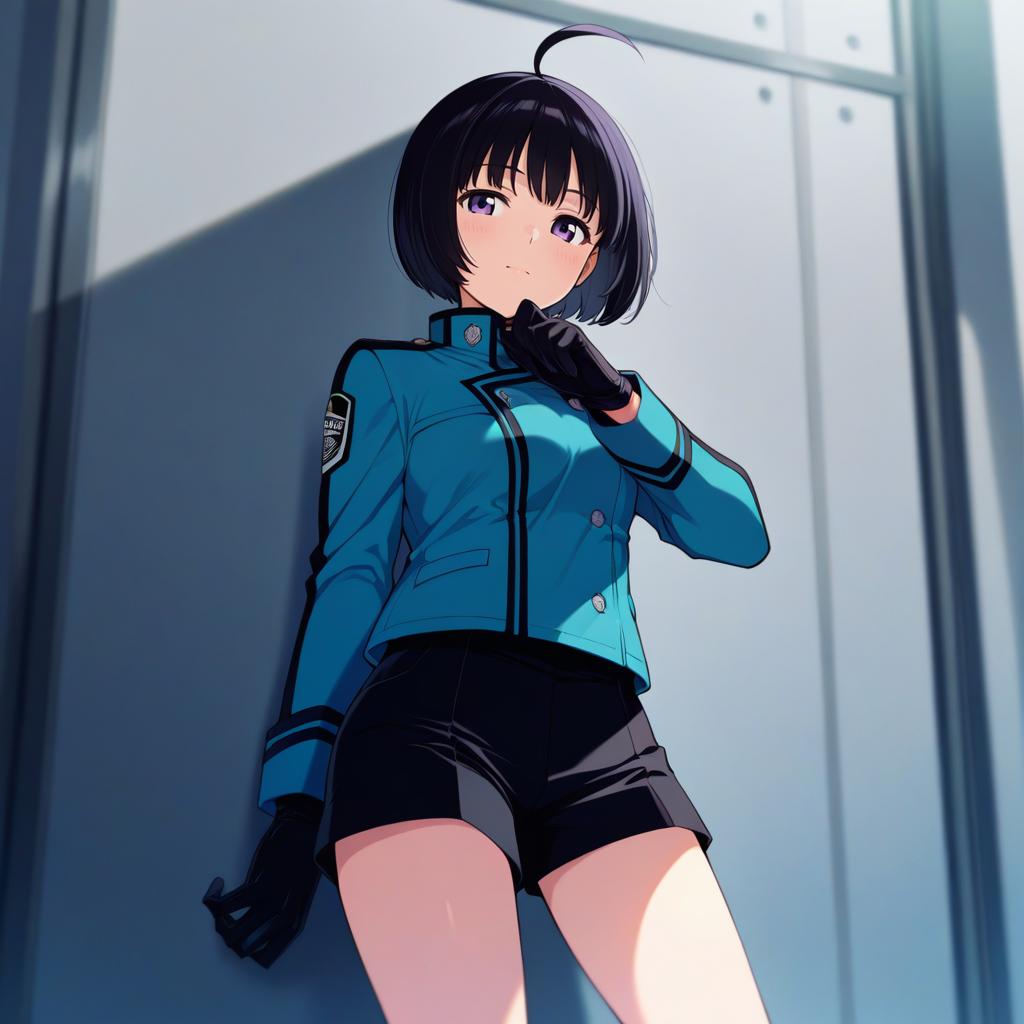 Amatori chika, world trigger, 1girl, purple eyes, short hair, black hair, ahoge, bob cut, mikumo squad's uniform, uniform, mikumo squad's uniform, black gloves, uniform, black shorts, blue jacket, long sleeves, by artist mizuki (flowerlanguage), illustrious