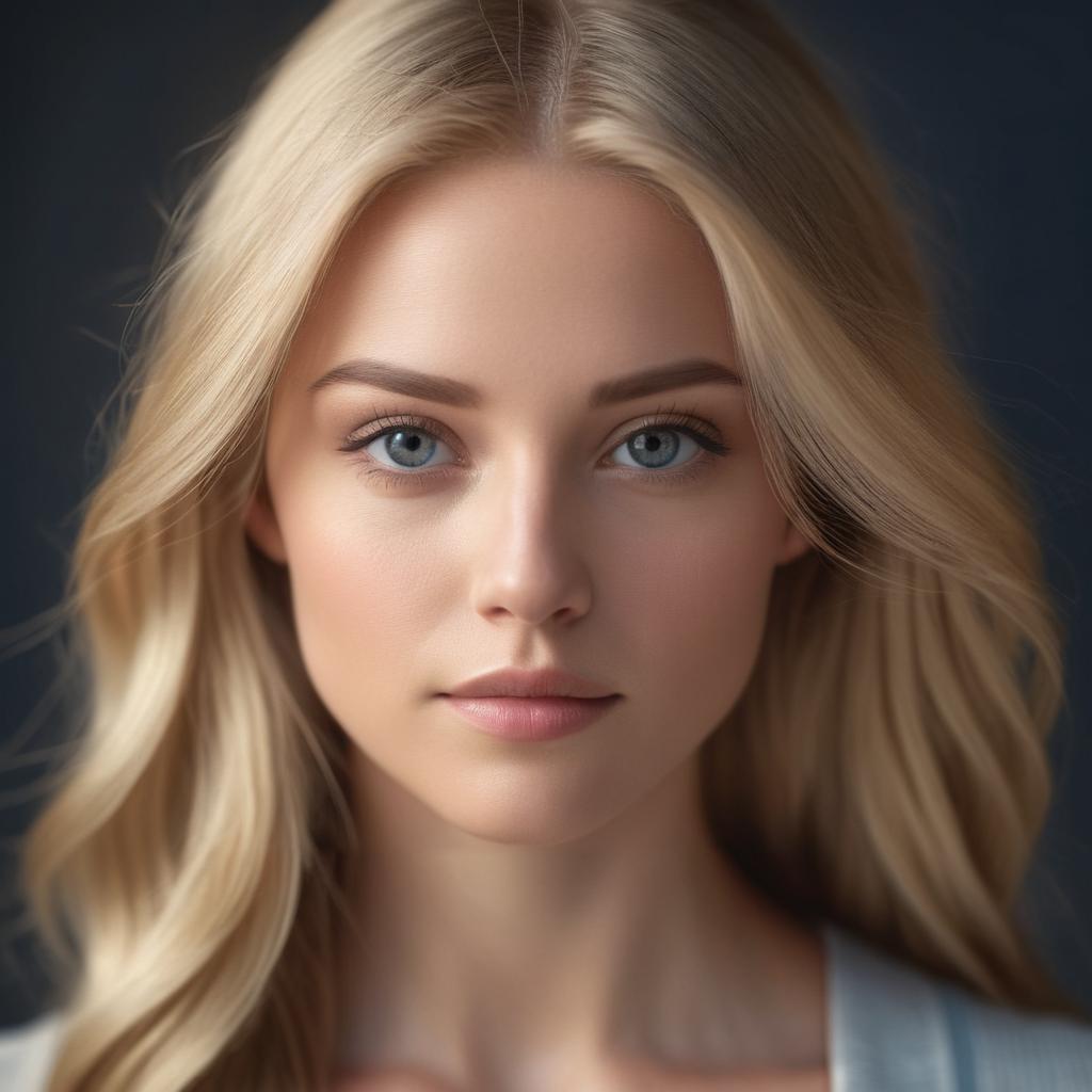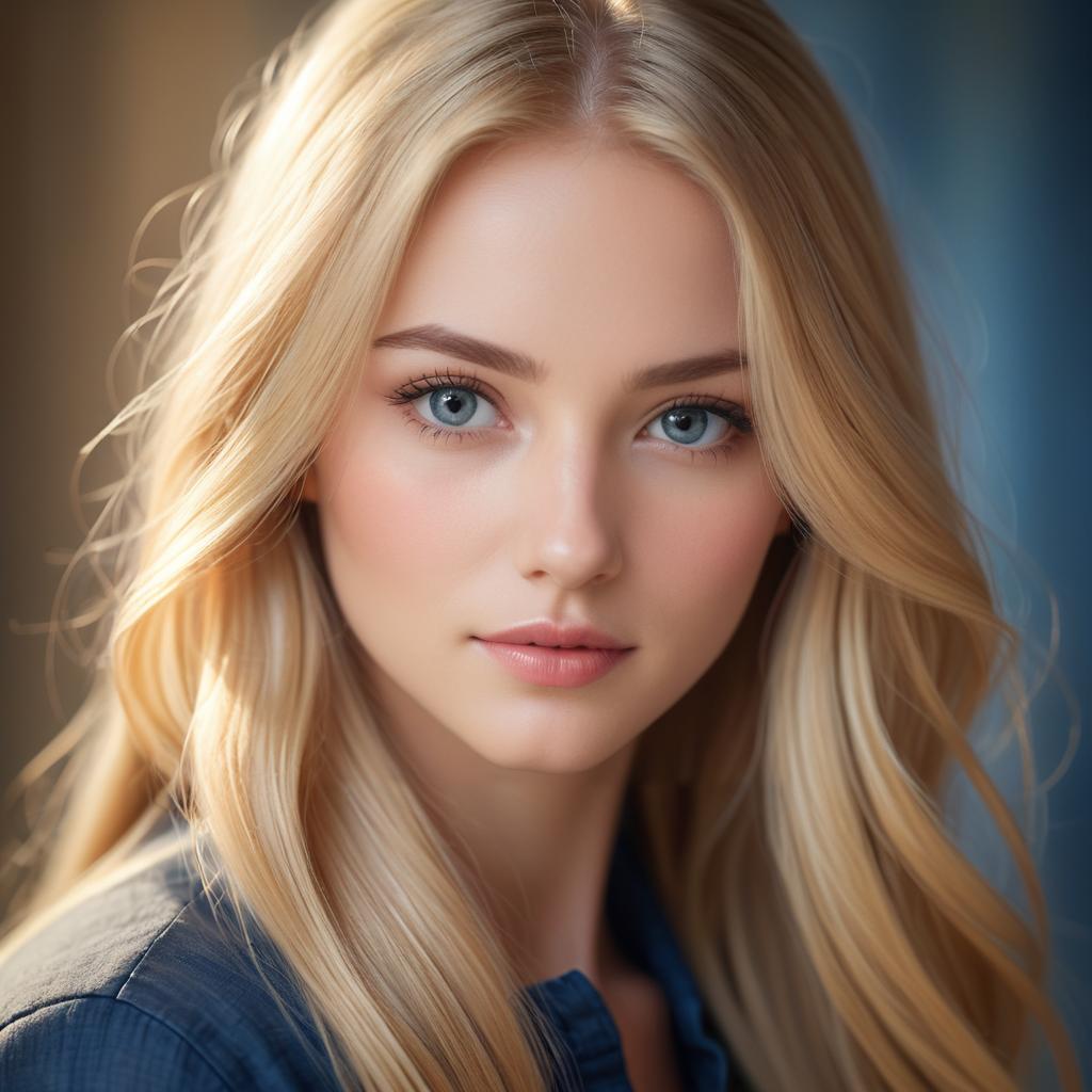 A realistic portrait of a young woman with long blonde hair and blue eyes, natural lighting softly illuminating her face, warm and neutral color tones, smooth skin texture with subtle shadows, soft focused background, natural expression, detailed hair strands, photographic style