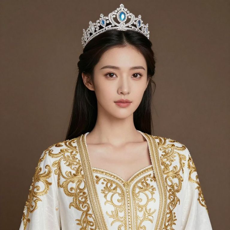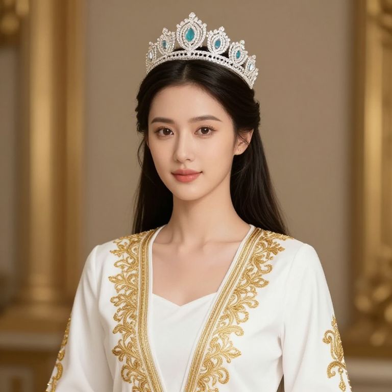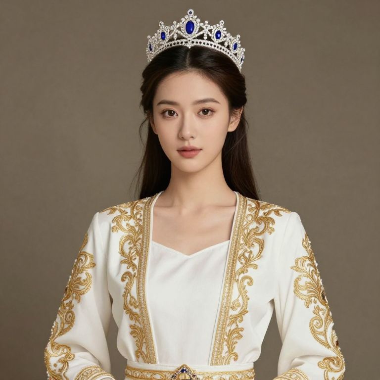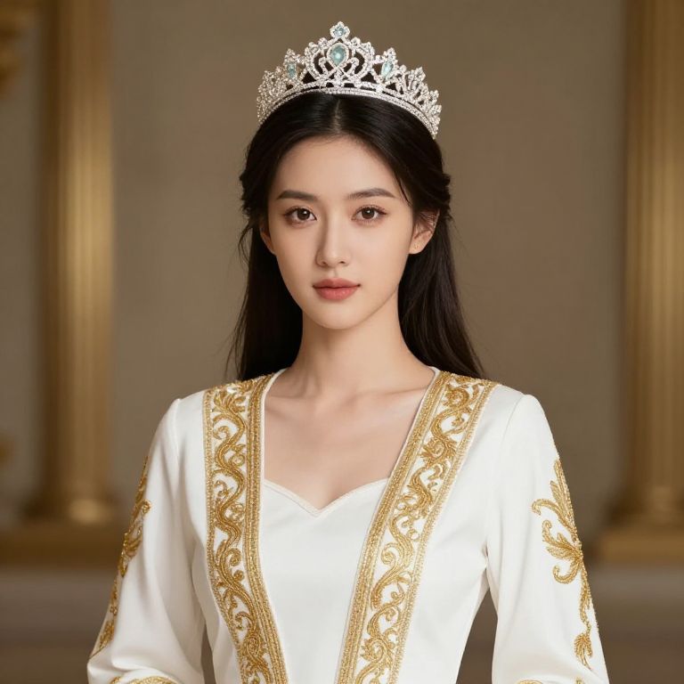 Female wearing a white dress with gold embroidery and a crown on her head.